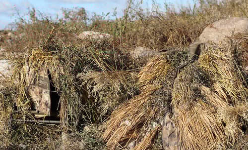 Invisi-Grass is protected with a Flame Retardant/Water Resistant treatment. Works great for layout blinds, ground blinds, boats, pits and anything else that you need to disappear. With the addition of some natural vegetation, this can make for a deadly combination.